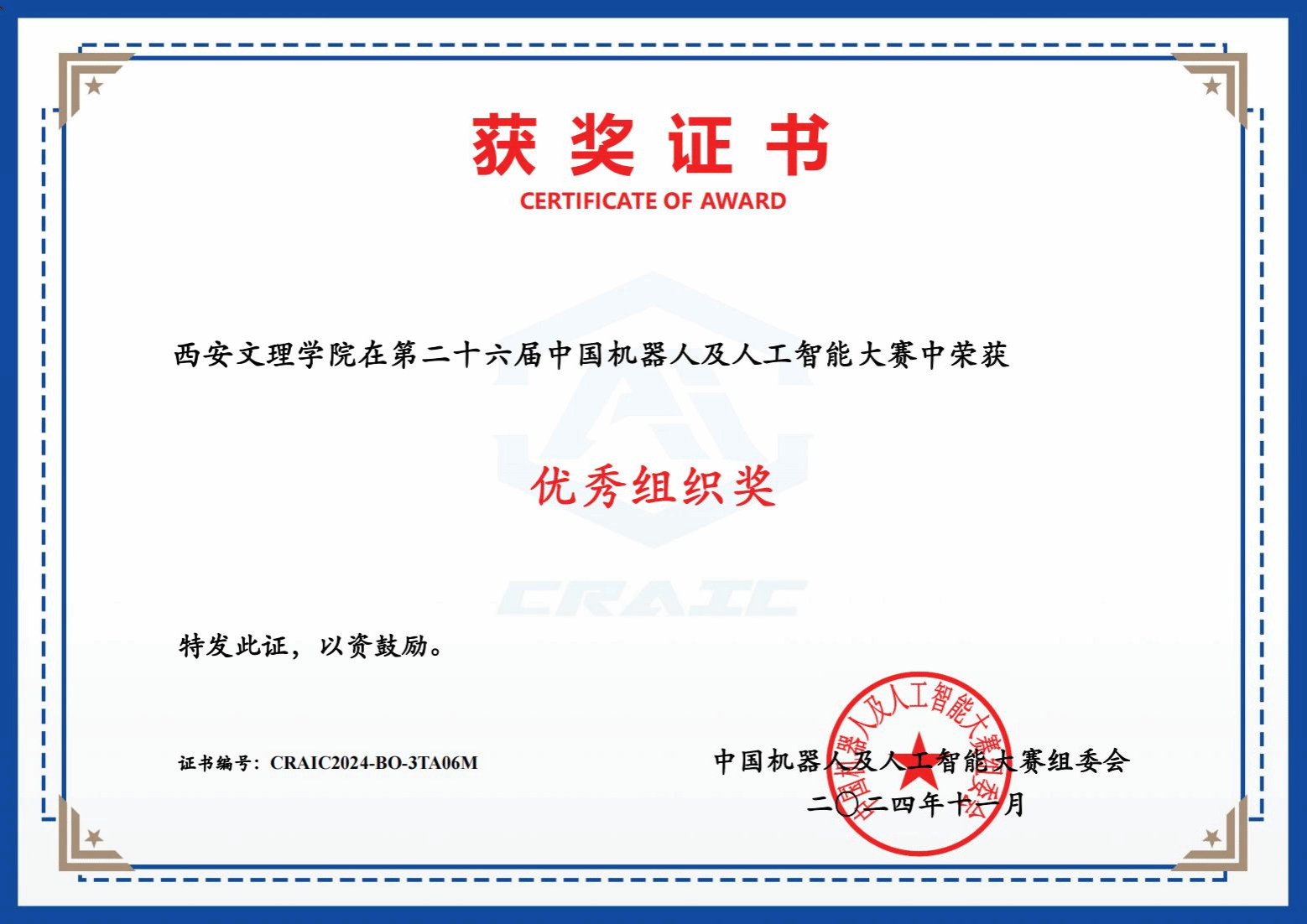 中国机器人及人工智能大赛由中国人工智能学会主办,属于国家级A类赛事,是围绕科技人才创新成长需求搭建的科技创新赛事平台。本届大赛共有全国744所高校的6200多支队伍,共计14000余名选手,围绕自动驾驶、无人机、机器人、人工智能等领域的前沿技术应用与实践进行技术交流、切磋并展开激烈对决。大赛中,今年会官网参赛选手凭借扎实的专业技能、出色的创新能力和团队协作精神,在层层选拔和激烈竞争中脱颖而出。今年会官网作为参赛组织单位荣获了全国优秀组织奖,今年会官网张伟、张丽红两位老师荣获全国优秀指导教师奖。