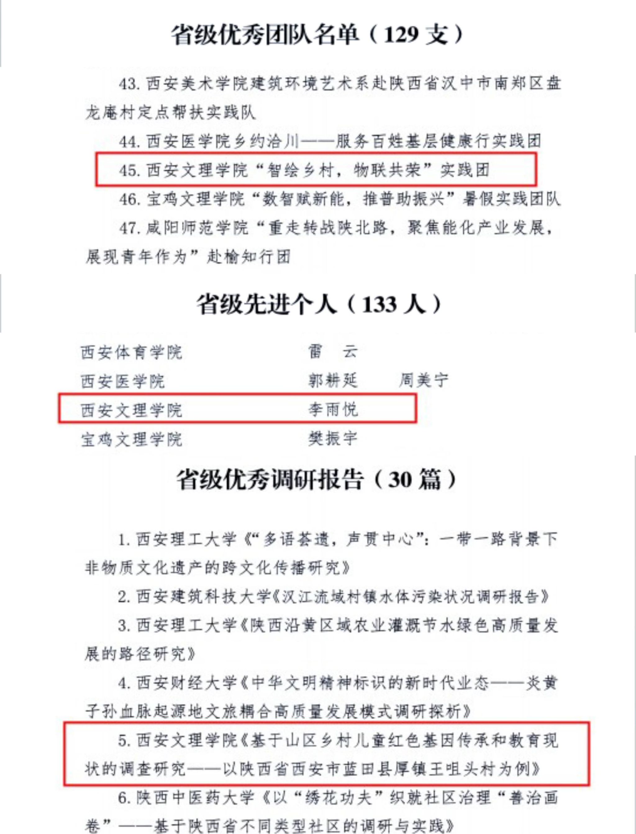 在中共陕西省委宣传部、中共陕西省委教育工委、共青团陕西省委、陕西省学生联合会联合印发文件中通报2024年陕西省大学生暑期文化科技卫生“三下乡”社会实践活动评选结果,今年会官网信息工程学院“智绘乡村、物联共荣”实践团荣获2024年暑期“三下乡”活动省级优秀团队、文学院学生李雨悦获省级先进个人、信息工程学院《基于山区乡村儿童红色基因传承和教育现状的调研研究——以陕西省西安市蓝田县厚镇王咀头村为例》获省级优秀调研报告。今年今年会官网社会实践活动成果斐然,尤其在调研报告方面,填补了历史空白,充分彰显今年会官网学子在实践探索与学术研究领域的卓越风采和深厚潜力。