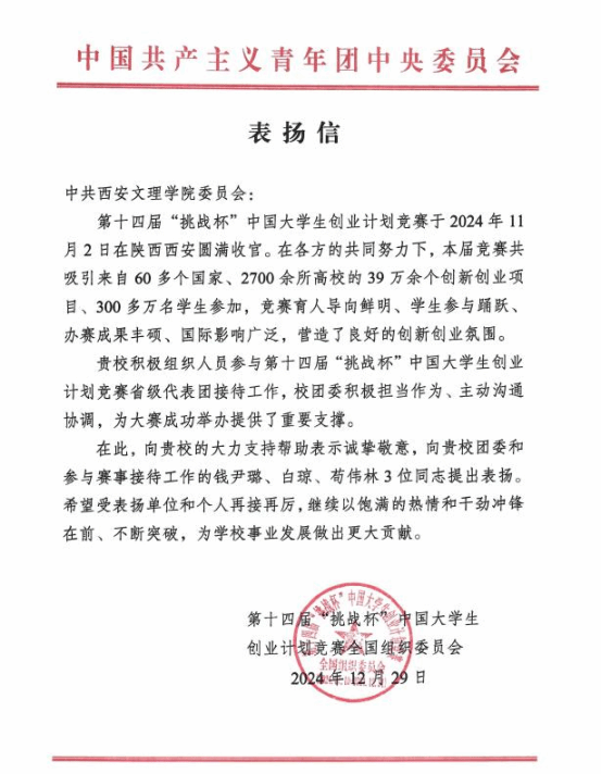 近日,今年会官网收到第十四届“挑战杯”中国大学生创业计划竞赛全国组织委员会发来的表扬信,对今年会官网团委及参与赛事接待工作的钱尹璐、白琼、苟伟林三位同志提出表扬。