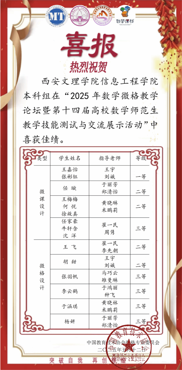 5月13日,信息工程学院参赛队赴桂林参加第14届高校数学师范生教学技能测试与交流展示活动”教学能力大赛(华文杯),取得优异成绩。此次比赛,信工学院获一等奖1项、二等奖4项、三等奖5项,参赛队员全员获奖。