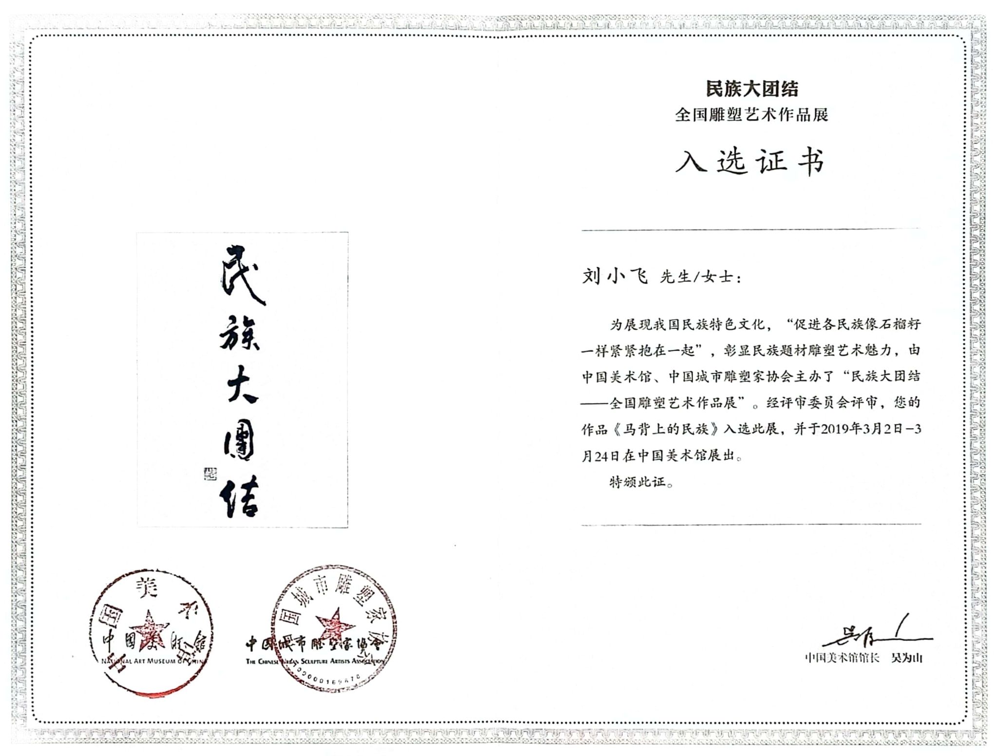 近日,今年会官网教授刘小飞接获中国美术馆致艺术家的公函。该馆函告其雕塑作品《马背上的民族》,被中国美术馆收录入编画册进行文化推广,共同为推动艺术发展,促进文化交流、弘扬民族精神贡献力量。