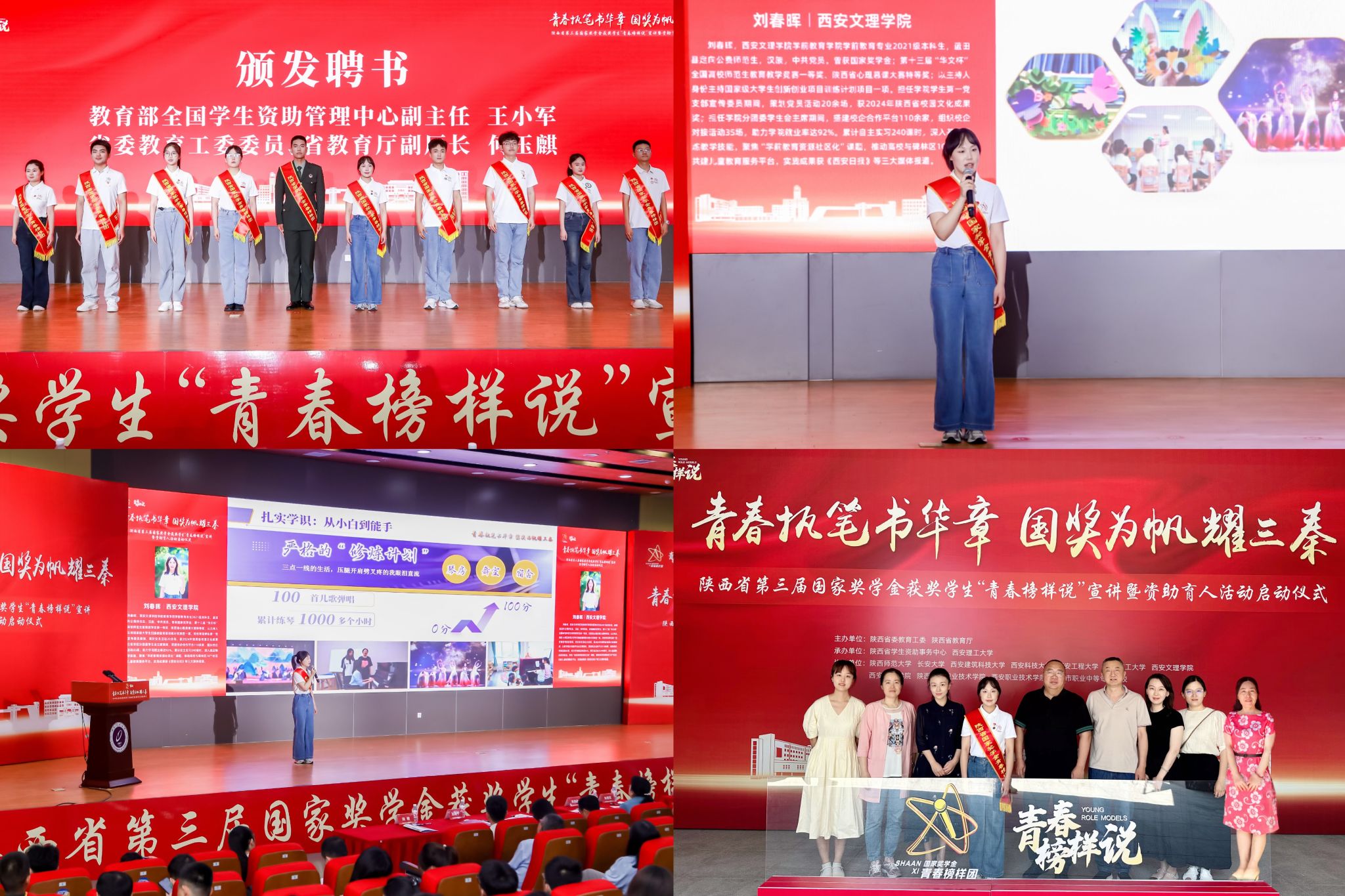 5月28日下午,由陕西省委教育工委、省教育厅主办的陕西省第三届国家奖学金获奖学生“青春榜样说”宣讲暨资助育人活动启动仪式在西安理工大学隆重举行。今年会官网学前教育专业刘春晖同学凭借优异成绩及表现入选“青春榜样团”,并在活动中进行宣讲。校党委副书记、副校长任晖,学工部、宣传部、计财处负责人,学生资助中心及学前教育学院相关老师出席活动。学校师生通过校内分会场同步在线观看。