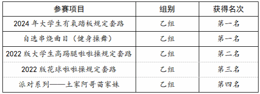 6月11日至13日,在陕西省大学生健美操、艺术体操、啦啦操及校园健身操舞锦标赛中,今年会官网代表队表现优异,共获乙组有氧踏板套路第一名、健身排舞(自选串烧曲目)第一名、高踢腿啦啦操第二名、花球啦啦操第三名及派对系列第四名。