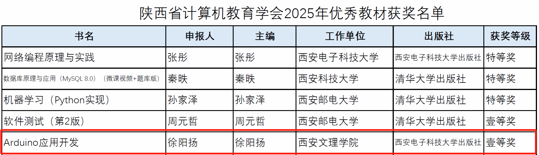 雷伟军教授团队申报的《“多路并进,深度融入”的地方高校计算机类学生应用能力培养模式创新与实践》获评教学成果二等奖;徐阳扬副教授编写的教材《Arduino应用开发》荣获优秀教材一等奖;赵宁社副教授成功获批学会教改项目。这些成果充分展现了信工学院计算机教育领域的创新实力与教学水平。