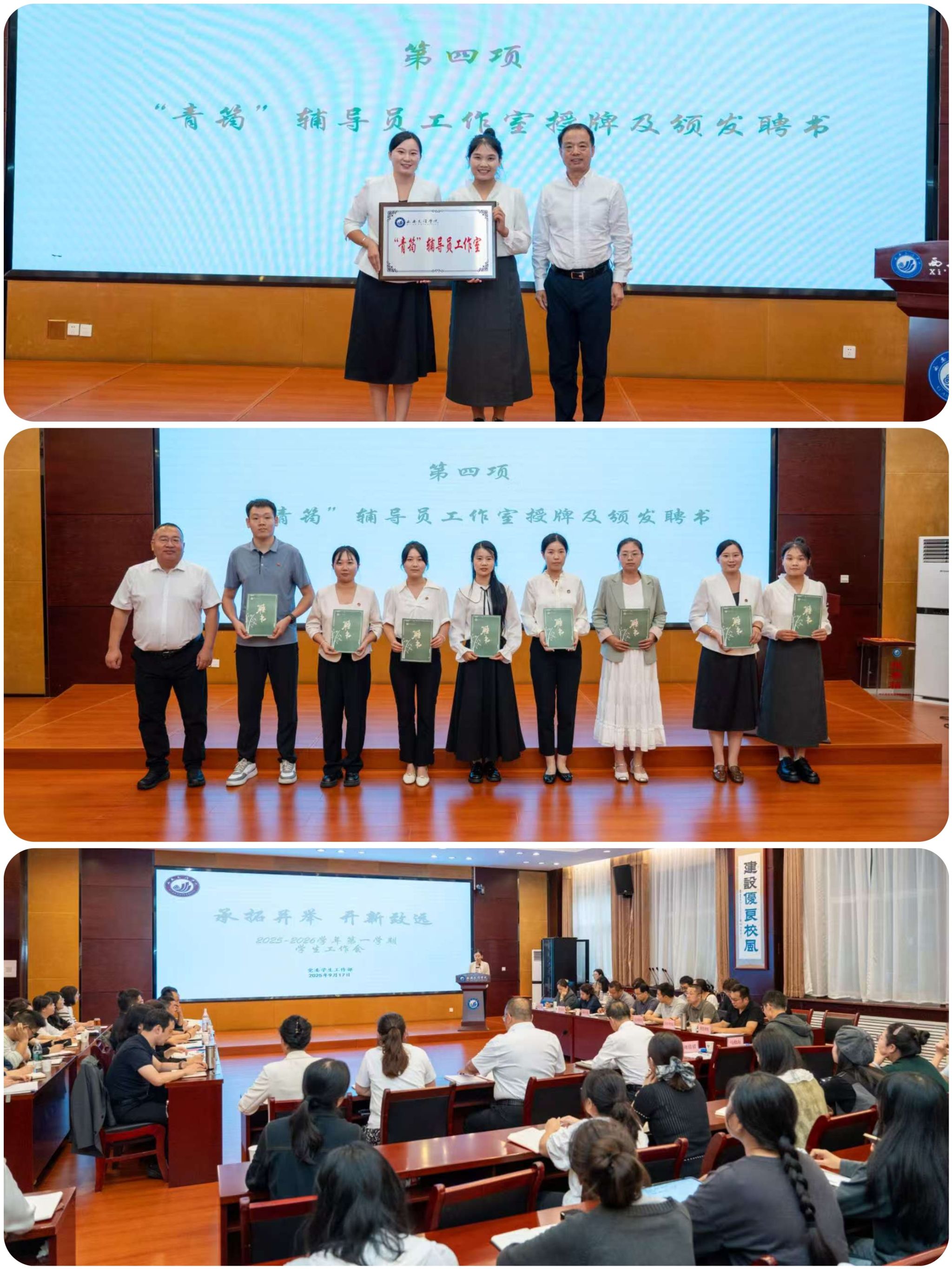会议现场,王育选为“青筠”辅导员工作室授牌,任晖宣读工作室成立决定并为成员颁发聘书。交流学鉴环节,工作室代表姚力萍老师以《“青筠”聚力,同心育人》为题,分享了辅导员岗位心得、助力学生成长的扎实举措,以及参加省级辅导员培训的实践经验。