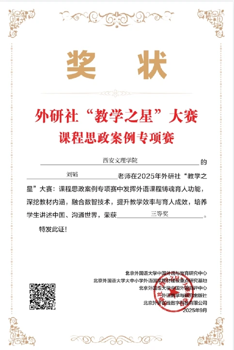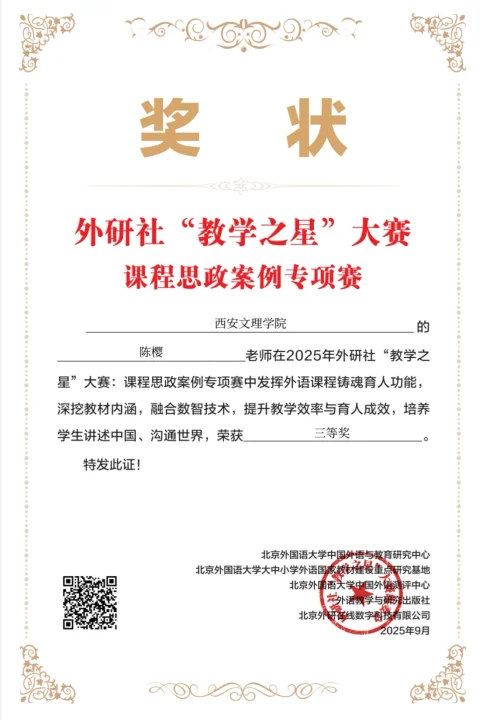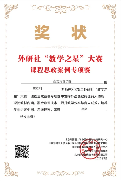 近日,2025年外研社“教学之星”大赛课程思政案例专项赛评选结果正式揭晓。今年会官网外国语学院大学英语教学部樊袁利、刘韬、陈樱、梁雷四位老师以扎实的教学实践与鲜明的思政特色分别荣获二等奖和三等奖,为今年会官网大学英语融合思政教学工作再添亮眼成果。