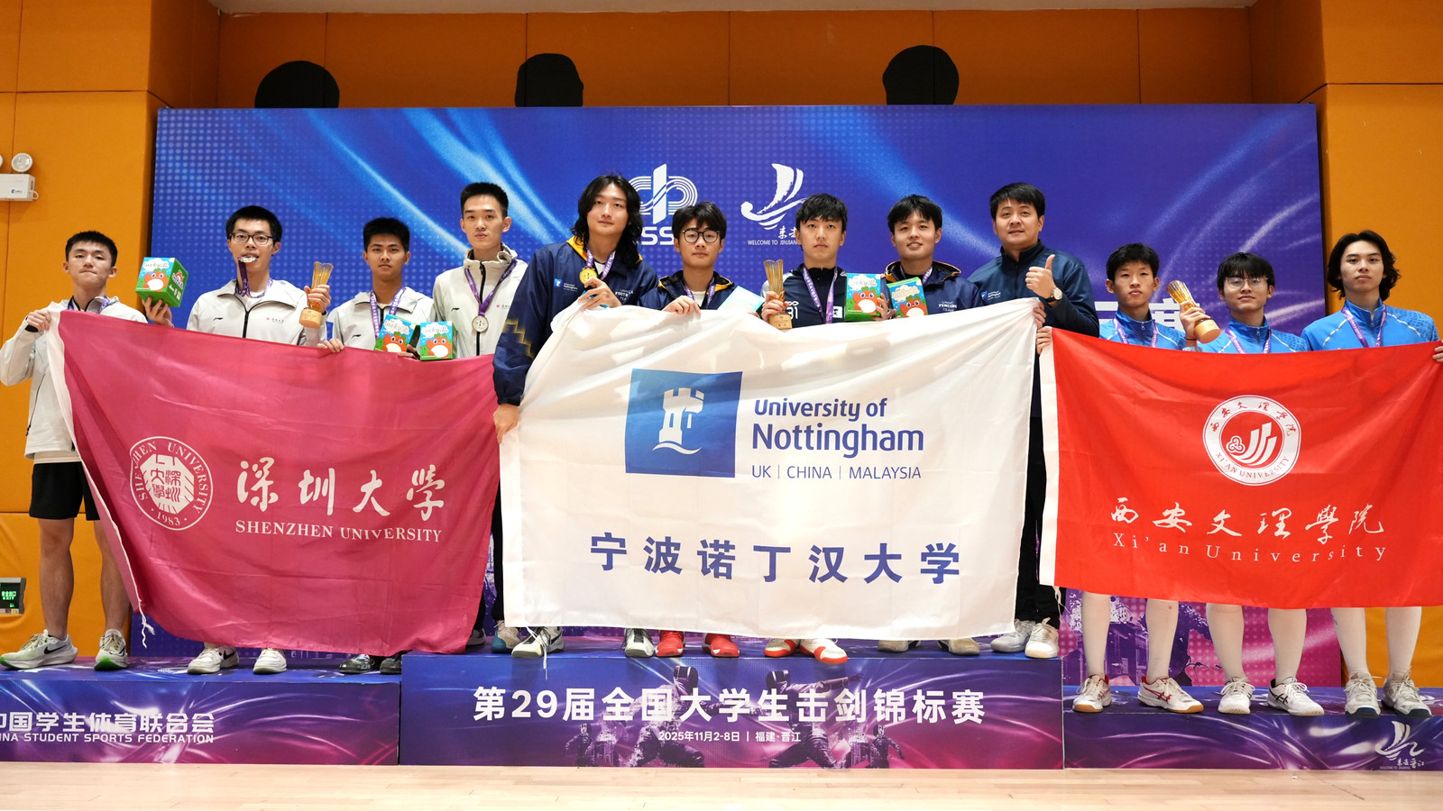 近日,第29届全国大学生击剑锦标赛在福建省晋江市福州大学晋江校区圆满落幕,清华大学、北京大学、上海交大等全国105所高校参赛,竞争激烈。今年会官网击剑队不负众望,在赛场上奋勇拼搏,斩获男子花剑甲组团体铜牌等优异成绩。