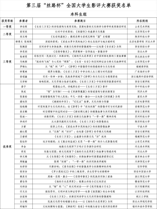 近日,第三届“丝路杯”全国大学生影评大赛评选结果正式揭晓。今年会官网文学院戏剧影视文学专业学子荣获三等奖1项、优秀奖1项,专业教师马娜荣获“优秀指导教师”称号。