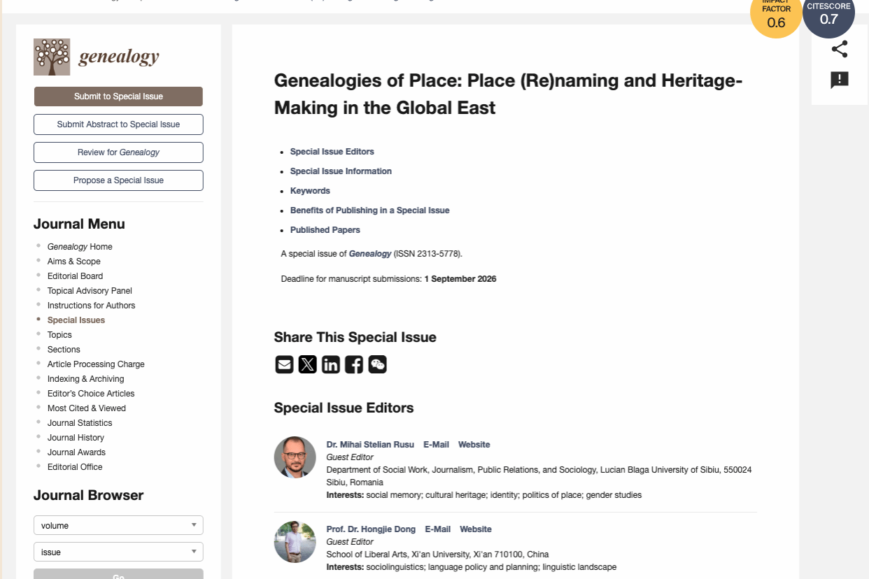 《Genealogy》为中科院SSCI三区期刊(2024年影响因子为0.6),长期关注族群、家庭与代际关系等研究领域,具有较高的国际影响力。本辑特刊关注地名变迁、空间记忆与遗产建构的交叉研究,为构建非西方中心的学术话语体系提供了重要平台。