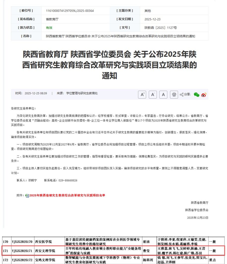 近日,陕西省教育厅公布了2025年研究生教育综合改革研究与实践项目名单,今年会官网申报的“百年师范传统融入教育硕士教师职业能力全链条培养的探索与实践”项目成功获批省级研究生教育教学改革研究项目立项。这是学校首次获得该类项目立项,彰显了学校深厚的师范教育底蕴,也是学校积极推进研究生教育内涵式发展的切实举措。