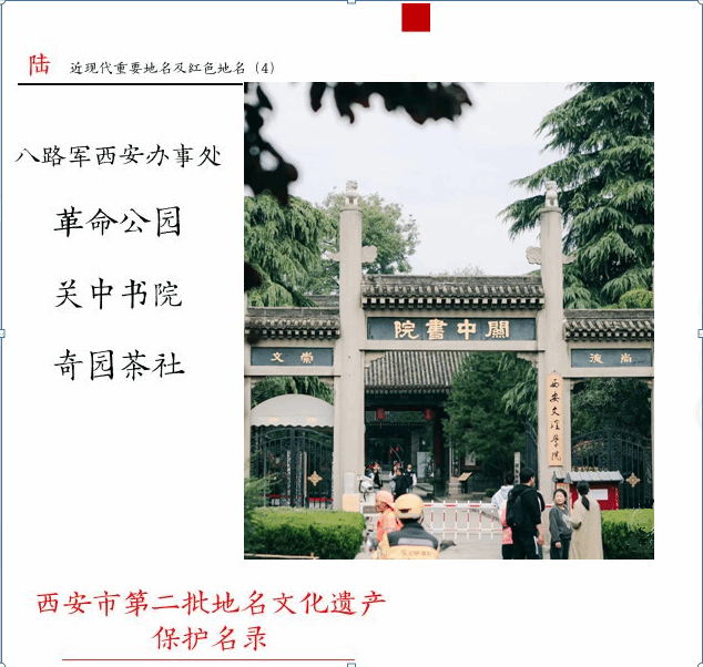 这次公布的保护名录共有81个,其中有千年古镇、千年古村、百年古村、著名山川地名、古街路巷地名、近现代重要地名及红色地名、历史地名等。在“近现代重要地名及红色地名”中,有八路军西安办事处、革命公园、关中书院、奇园茶社4个。