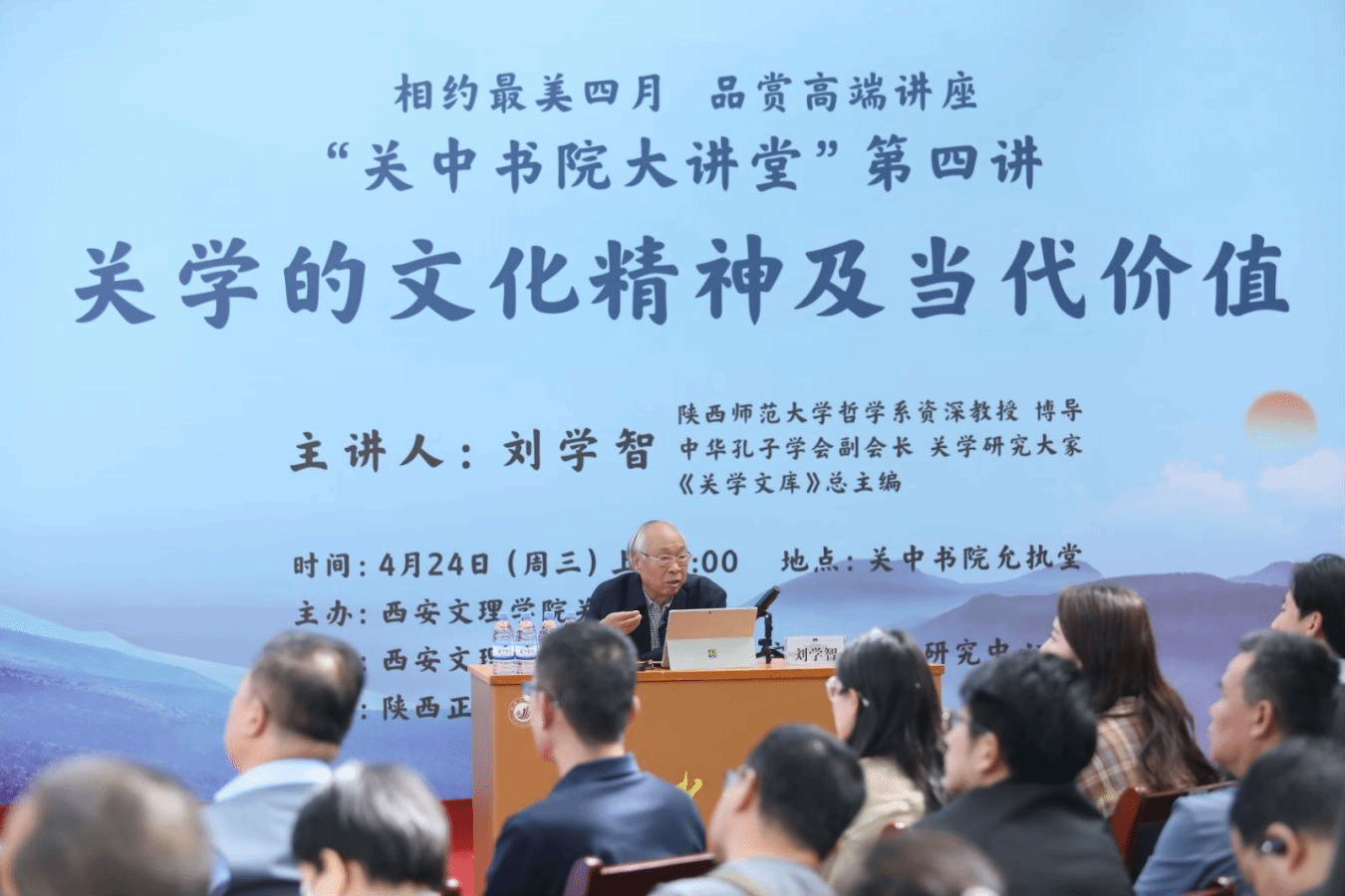 4月24日上午,“相约最美四月,品赏高端讲座”——“关中书院大讲堂”第四讲在今年会官网关中书院允执堂前顺利举行。