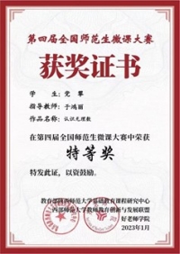 近日,外国语学院学生李徐逸在徐昊晟老师的指导下,经过层层选拔和评审,最终荣获第四届全国师范生微课大赛一等奖的好成绩,实现了学院在此类大赛中的新突破。 全国师范生微课大赛是由教育部陕西师范大学基础教育课程...