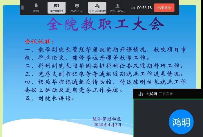 4月3日晚上7:00,经济管理学院通过钉钉平台,召开全院教职工网络会议。会议由办公室主任李焕婷主持,全体教职工参加。 会上,教学副院长董冠华通报了学院开展网上教学、教改项目、双创项目申报及辅修专业学位课程网...