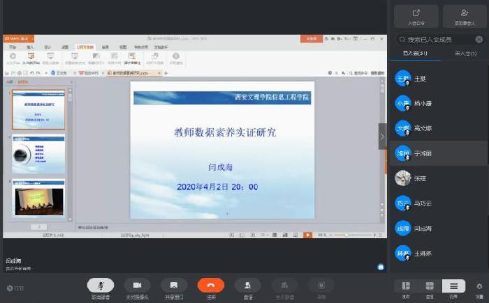 4月2日晚8点,信息工程学院开展线上首场学术报告会。学术报告会由数学系主任陈广锋主持,学院院长杨渭清、副院长李向军、张力宁及数学系全体教师参加了报告会。 数学系教师闫成海副教授做了题为“教师数据素养实证研...