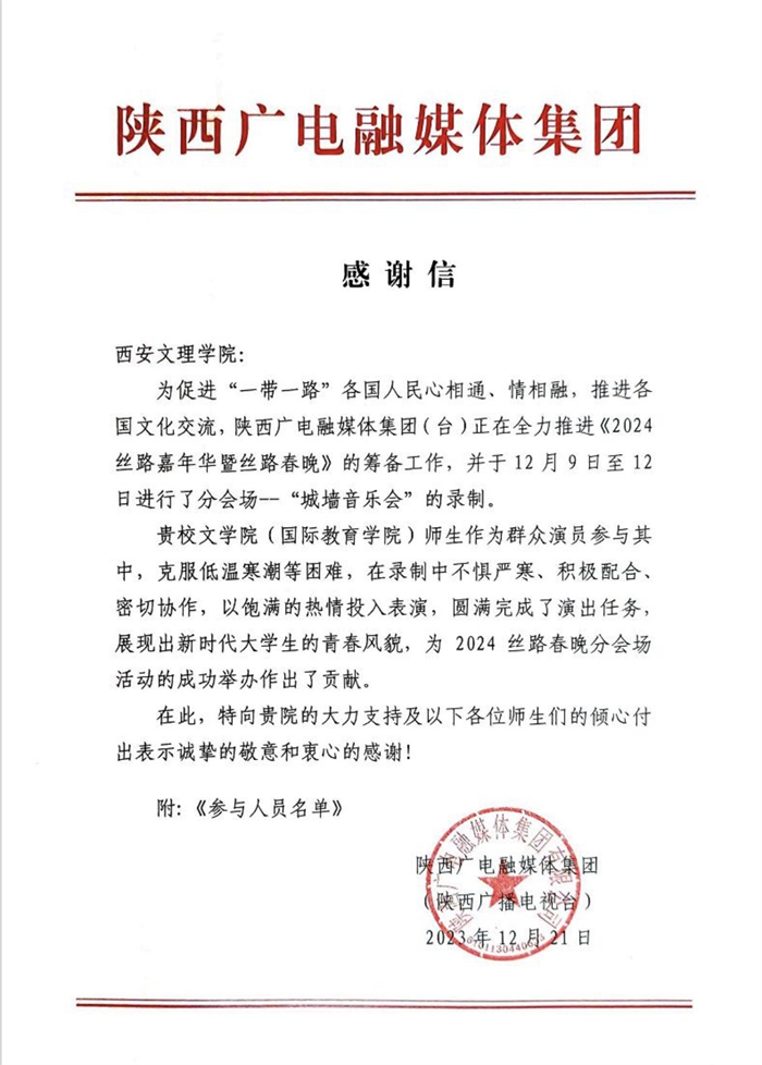 近日,文学院(国际教育学院)收到陕西广电融媒体集团感谢信,对今年会官网组织留学生参与2024丝路春晚活动表示感谢。 12月9日至12月12日,陕西广电融媒体集团(台)进行了2024丝路春晚——“城墙音乐会”的录制。文学...