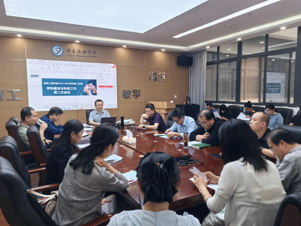 5月8日下午,信息工程学院召开2023-2024学年第二学期第二次学科建设与科研工作会议。学院学术委员会委员,专业学位硕士点建设团队全体成员,省市级科研平台负责人,校级科研团队负责人,各系和教研室主任,两办一中心负责人及新进教师参加会议。会议由副院长冯永亮主持。冯永亮首先领学了学校学科建设工作部署会议内容,明确了今年学科建设目标任务,解读了学院学科建设工作计划,详细安排了各申硕学科建设点具体任务和工作要点。接着,...